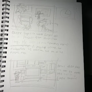 Aside from the usual computer trouble I keep having all day, I've also wrote a draft for a children's book that partially emulates my current state with technology. It's about this man who had a collection of computers and gadgets that have gotten worn out, so he builds himself a new piece of technology built with what he purposefully wanted. Here's a few rough sketches out of this rather interesting story I made after whatever happened that day, also before another out-of-question moment that happened the following day.